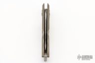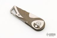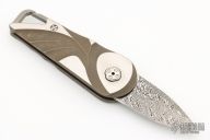 This Mini Auto by Brian Tighe features a Damasteel finish blade with false top edge. The handle has a tumble/satin/anodize finish and milled titanium frame with blasted finish carabiner style clip. Fast opening, strong lockup. Comes with a zippered case. New from maker!