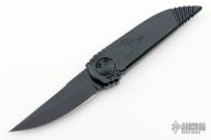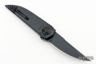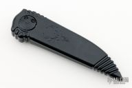 This Phoenix model sports a black handle with a phoenix laser etching and a CPM-S30V steel blade with a black cerakote finish. The top edge of the knife has been sharpened.