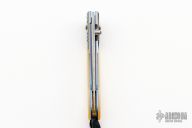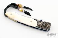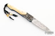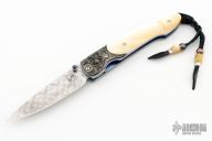 "The original classic William Henry's first design still going strong more than 10 years later. The Lancet defined, and continues to define, the essential gentleman's folder in the modern world. Sleek, elegant, refined, and comfortable in the hand and to the eye. Like many of our designs, the Lancet offers maximum flexibility and utility simply an exceptional daily carry tool, worthy of virtually any cutting task that comes along. Winner of multiple industry awards, in a variety of iterations over the years, the patterns shown here are all new limited edition offerings continuing the Lancet's legacy in fine cutlery." This Lancet linerlock folder features a Stainless Damascus blade, carved sterling silver bolsters with inlaid sapphire, anodized titanium liners, gold lip pearl scales. Numbered 29/50 on interior. Includes original box, sheath and paperwork. Excellent condition.