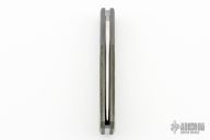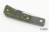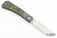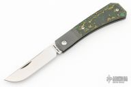 This Pioneer Jack slipjoint (Farmer's Knife) by Jack Wolf Knives features a satin finished clip point blade with nailnick. The handle has integral bead blast finish pinched, fluted, titanium bolsters with Fat Carbon covers and a stainless spring. Comes with box, metallic tube with Sean Tiffany artwork, leather slip, and cloth. New from maker!