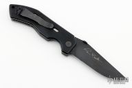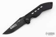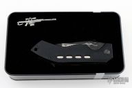 This Barrett M50 linerlock folder has a black blade and a black G10 handle. Black stainless steel clip. Barrett Firearms logo on front of blade, Emerson logo on reverse side. Dated 2003. Includes original packaging. Includes Model 82A1 pewter lapel pin. Excellent condition. #099