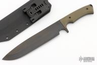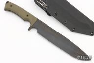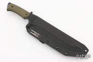 This camp knife by Medford knives features a black PVD blade with .281" blade stock and 1.61" blade depth, full tang construction with green G-10 scales. Comes with a black kydex sheath, zippered case and papers. Has a couple light sheath scuffs, excellent condition otherwise.