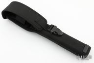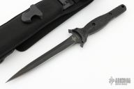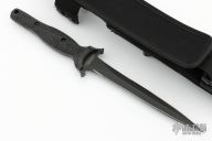 This Suppressor has a black N690 stainless steel dagger blade with full tang and integral double guard with notched thumbrest. Blade stock is 1/4", and depth is just over 3/4". Handle is Poliammide non-slip with removable glass breaker and lanyard hole. Excellent condition. Comes with Kydex nylon sheath with leg straps, extended glass breaker. Comes with original box and papers.