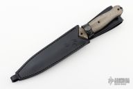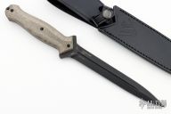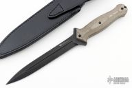 The Steel Will Fervor 1201 is a tactical double-edged dagger. A striking feature of this knife is its symmetry. On the logo and the specifications on the blade are perfectly equal on both sides. The blade is made of Austrian Böhler N690Co steel, which is very well-known. The black ASPIS MIL-DTL-13924 military coating reflects does not reflect, which can be expected from a tactical knife. The micarta handle, made with 3D technique, provides plenty of grip and looks very nice. Micarta is a composite material made of canvas and resin. It even gives a lot of grip in wet conditions or when wearing gloves. The material is porous and may discolor by moisture or sweaty hands. This gives the knife a really unique look. Comes with original box, COA, and sheath. Excellent condition.