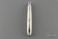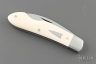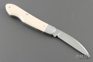 This slipjoint by David Taber features a hand rub satin finished blade with nail nick. The handle has steel bolsters, mammoth ivory covers, stainless steel liners, escutcheon and spring. Comes with a leather case. Excellent Condition.