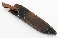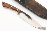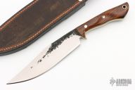 This Gunfighter Bowie by Lon Humphrey features a hand forged blade with satin finished grinds and forged finished flats, has false top edge, .190" blade stock and 1.615" blade depth, full tang construction. The handle has Desert Ironwood scales with yellow liners, stainless steel pins and lanyard tube. Comes with a brown leather sheath. Has some light scuffs and scratches, great condition otherwise.