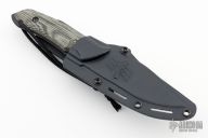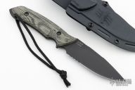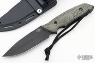This knife features an H-146 Graphite Black Cerakote finished spear point partially serrated blade, 5/32" blade stock and 1 3/8" blade depth, full tang construction. The handle has milled black canvas micarta scales with extended tang and skull crusher. Comes with a desert tan kydex sheath with TekLok. Has some light sheath marks and some scratches, great condition otherwise.