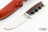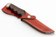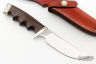 This Model 475 by Gerber Legendary Blades features a mirror polished upswept blade with notched thumbrest, .177" blade stock and 1.230" blade depth, hidden tang construction. The handle has a stainless steel guard and butt with wood grip and brass spacers, has finger grooves. Comes with a brown leather sheath and a black Gerber box and papers, but the label has been removed. Has a few light scratches, otherwise excellent condition.