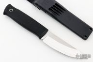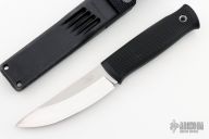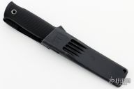 This H1 hunting knife by Fallkniven features a satin finished VG-10 core San Mai blade with .197" blade stock and 1.106" blade depth, hidden tang construction. Thermorun handle with thong hole. Comes with original sheath. Excellent condition.