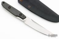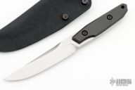 This custom fixed blade by Kazutoshi Tanabe features a hand rub satin finished blade with a false top edge and notched thumbrest, .239" blade stock and .936" blade depth, full tang construction. The handle has carbon fiber scales. Comes with kydex sheath. Excellent condition.