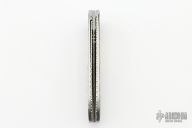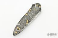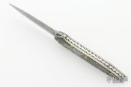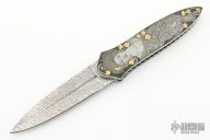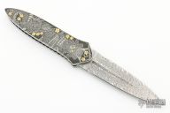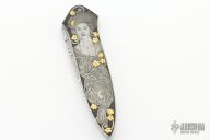 This knife by Attilio Morotti features a Damasteel dagger style blade with a false top edge and 24k gold inlays. The handle has stainless steel scales with embossed 24-karat gold dedicated to the samurai and the Geisha done by Fabio Bergoli, fileworked stainless steel liners and backspacer.  Inside of the frame is mirror polished. Nice smooth action, detent, lockup and blade seating. Comes with a padded zipper case and COA.  Excellent Condition.