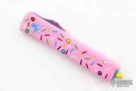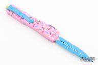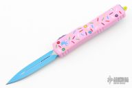 This UTX-70 features a blue dagger shape blade. The handle has the Dessert Warrior finish aluminum handle with stainless steel hardware, thumb slide and tip down pocket clip. Dated 01/2023. Comes with original box and papers. Comes with a pair of "Dessert Dice" as well. New condition.