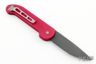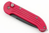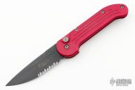 This L-UDT side opening auto by Microtech features a black partially serrated blade. The handle is red aluminum. Has tip up stainless steel clip. Dated 06/2001, Serial# 2286. Excellent condition. Comes with original box and papers.