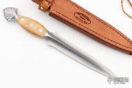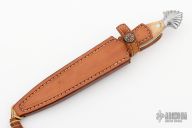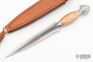 This dagger by Billy Mace Imel features a double edged hand rub satin finished blade, .577" blade stock and .995" blade depth, full integral with tapered tang. has walrus ivory inlays. Excellent grinds and finish work. Great feel in the hand. Comes with brown leather sheath and zippered case. Excellent condition.