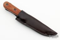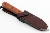 The handles are bolt-on in typical Becker fashion, but the scales are made of walnut wood for a classic look and warm feel. The handles are slim but hand filling, and a swell at the front enables excellent purchase for pinch grips and when choking up for fine work. A tapered tang makes for perfect composure, with the balance point hitting right at the index finger. Also included is a period accurate brown leather sheath for easy and secure carry.