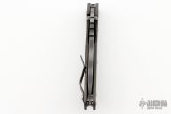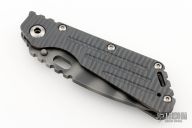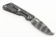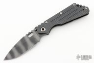 This Mick Strider Performance Series SMF framelock folder features a black finished spear point blade with thumbhole and notched thumbrest. The handle has a flamed titanium frame with titanium clip, tip up carry. Jimping on blade spine. Includes Hinderer "Lock Bar Stabilizer" for maximum reverse lock retention. Nice detent, lockup and blade seating. New condition.
