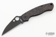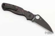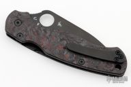 This Paramilitary 2 Liner lock Folder from Spyderco has a black finished wharncliffe blade with thumbhole and notched thumbrest. Handle has Ripp's Garage Tech Dark Matter Red Carbon Fiber scales, nested stainless steel liners, black DLC titanium machined tip up clip, Ripp's Garage Tech dark titanium lanyard tube. Comes with original box, zippered and papers. Excellent condition.