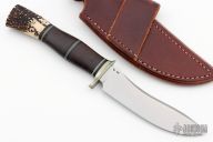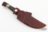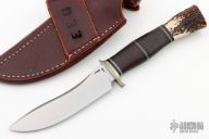 This Scagel Style Hunter by Master Smith P.J. Tomes features a satin finished blade with false top edge, .160" blade stock, 1.154" blade depth, hidden tang construction. The handle has a nickel silver guard, stacked leather grip with black and nickel silver spacers, and a stag pommel. Excellent condition. Comes with a brown leather sheath and zippered case.