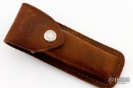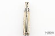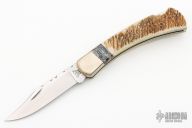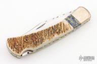 This Model 110 by Buck has been customized by Leroy Remer, it features a satin finished blade with nail nick and fileworked spine. The handle has a nickel silver frame, moose scales with mammoth tooth spacers, fileworked stainless steel backspacer. Comes with a brown leather sheath and a zippered case. Has a couple light scratches, otherwise excellent condition.