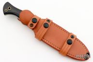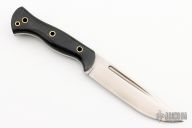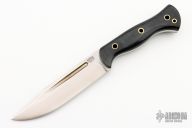 This Cub by Bark River Knives features a satin finished blade with a notched thumbrest and fullers, .191" blade and 1.227" blade depth, full tang construction. The handle has black canvas micarta scales with brass pins. Comes with a brown leather sheath and original box. Excellent condition.