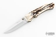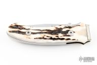 This Linerlock Folder by Kansei Matsuno features a mirror polished blade with a false top edge. The handle has nickel silver bolsters, beautiful stag scales, titanium liners and a stainless steel backspacer. Very classy. Comes with zippered case. Has a few very light scratches, otherwise excellent condition.