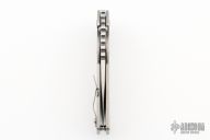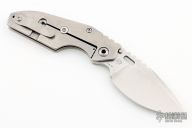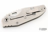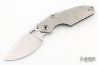 This XL Jibble by Mick Strider features a stonewashed blade with notched thumbrest and a thumbhole. The handle has a stonewashed titanium frame with tip up reversible clip. Nice detent, lockup and blade seating. Comes in a zipper case. Excellent condition.