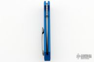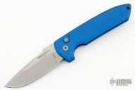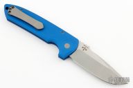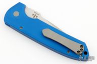 This LG301 Rockeye has a stonewashed blade with satin flats and notched thumbrest. The handle has a blue aluminum frame with a matching steel tip up pocket clip and a push button. Typical flawless Pro-tech mechanics and blade seating. Comes with original box and papers. Comes with Ripps Garage Tech 3D clip. Excellent condition.