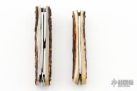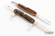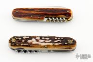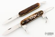 These slipjoints have polished blades with nail nicks. The handles have stag covers, brass liners and steel springs. A couple light scratches, otherwise they are both in excellent condition. The larger one is 3.875" closed and the small is 3.625" close.
