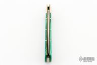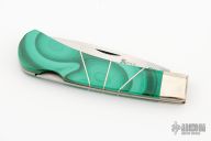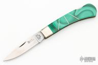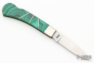 This Lockback by Camillus Knives was customized by Santa Fe Stoneworks. It features a satin finished blade with nail nick. The handle has nickel silver bolsters, malachite scales with nickel silver spacers, brass liners, stainless steel backspacer. Has a few light scratches, otherwise excellent condition.