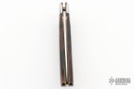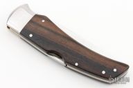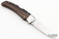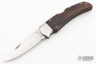 This Gerber lockback features a polished blade that is stamped "by SAKAI/JAPAN". The handle has stainless steel bolsters and wood scales, brass liners and steel backspacer. Comes with a nylon sheath. Has scratches and some light oxidation spots, otherwise good condition for its age.
