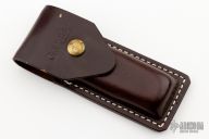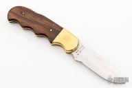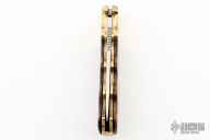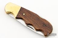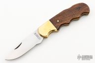 This lockback by Gerber features a satin finished drop point blade with nail nick. The handle has a brass frame with wood inlays. Has some scratches, has otherwise good condition for its age. Comes with original brown leather sheath.
