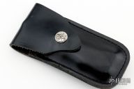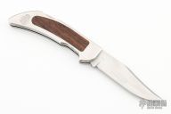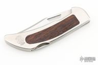 This vintage lockback folder by Smith and Wesson features satin finished blade with nail nick. The handle has a stainless steel frame with wood inlays. Has some scratches, otherwise good condition. Comes with an original black leather sheath.