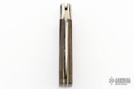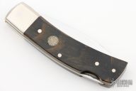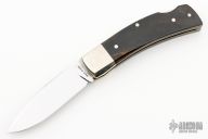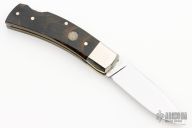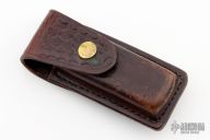 This vintage lockback folder by Smith and Wesson features mirror finished blade. The handle has nickel silver bolsters, wood scales, brass liners, stainless steel backspacer. Has some scratches, otherwise good condition. Comes with an original brown leather sheath.
