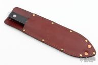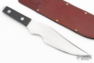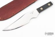 This Tru-Balance throwing Knife features a mirror polished blade with .183" blade stock and 2.186" blade depth, full tang construction. The handle has paper micarta scales with hand peened rivets. Comes with original brown leather sheath. Has some scratches otherwise excellent condition.