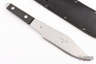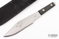 This Tru-Balance throwing bowie-axe features a satin finished blade with sharpened top edge, .199" blade stock and 2.018" blade depth, full tang construction. The handle has black paper micarta scales with hand peened rivets. Comes with a black leather sheath. Has some scratches, otherwise the knife is in excellent condition.