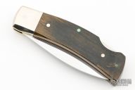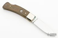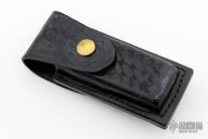This vintage lockback folder by Smith and Wesson features mirror finished blade. The handle has nickel silver bolsters, wood scales, brass liners, stainless steel backspacer. Has some scratches, has been resharpened, otherwise good condition. Comes with an original black leather sheath.