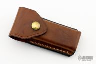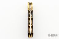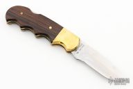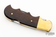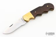 This lockback by Gerber features a satin finished drop point blade with nail nick. The handle has a brass frame with wood inlays. Has a couple light scratches, otherwise excellent condition for its age. Comes with original brown leather sheath.