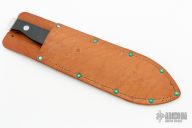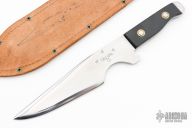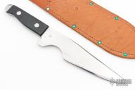 This Tru-Balance throwing Knife features a mirror polished blade with .185" blade stock and 1.994" blade depth, full tang construction. The handle has black paper micarta scales with hand peened rivets. Comes with a brown leather sheath. Has some light scratches, otherwise excellent condition.