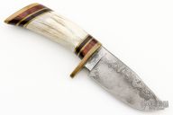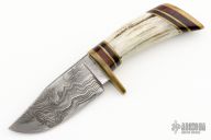 This knife by ME Buckner features a Damascus blade with .194" blade stock and 1.343" bladed depth, hidden tang construction. The handle has a brass buard and butt, stag grip with brass and cocobolo spacers. Comes with a zippered case. Excellent condition.