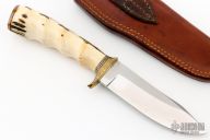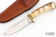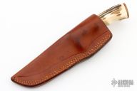 This Hunter by Lloyd Hale features a mirror polished blade with false top edge, .186" blade stock and 1.206" blade depth, hidden tang construction. The handle has a brass guard and butt, finger groove stag grip, black/brass/white spacers. Comes with a brown leather sheath and a zippered case. Excellent condition.