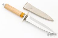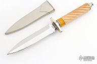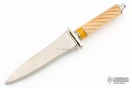 This Dagger by Todd Kopp features a mirror finished double-edged blade with .213" blade stock and 1.278" blade depth, hidden tang construction. The handle has nickel silver guard, butt and collar with amber spacer. Comes with a nickel silver scabbard and a zippered case. Excellent condition.