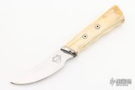 This skinner by Jim Thill features a mirror polished bade with .119" blade stock and .888" blade depth, hidden tang construction. The handle has a stainless steel guard and bone grip with finger grooves. Comes with a zippered case. Excellent condition.