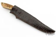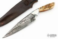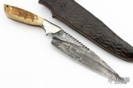 This knife by Chris Peterson features a Damascus blade with visible temper line, fileworked spine, .294" blade stock and 1.889" blade depth, full tapered tang construction. The handle has nickel silver bolsters, sheephorn scales with red liners. Comes with a hand tooled black leather sheath. Excellent condition.