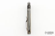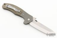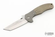 This PoBoy Emerson Super Roadhouse features a stonewashed blade with notched thumbrest, thumbdisc and wave feature. The handle has bead blast dovetailed titanium bolsters, bead blasted titanium liners, the locking liner is thicker, and green canvas micarta scales, green canvas micarta backspacer, stainless steel tip up clip. Includes a original box and papers. Nice detent, lockup and blade seating. Has some scuffs/scratches, otherwise excellent condition. Dated 2011 and #051