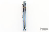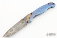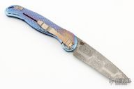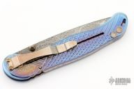 This Apogee D/A Auto by Darrel Ralph features a recurve Mosaic Damascus blade with dual thumbstuds. The handle has a carved and anodized titanium frame with bronzed hardware and tip down stainless steel clip, fileworked stainless steel spring. Nice action, detent, lockup and blade seating. Excellent condition. Comes with a Velcro case.
