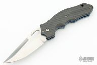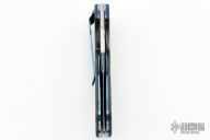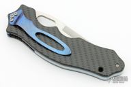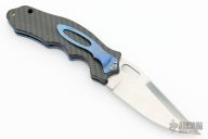 This Triumph Raider by Crawford Knives features a satin finished blade with thumbhole. The handle has anodized titanium liners, carbon fiber scales, stainless steel backspacer and an anodized and jeweled titanium tip down clip. Nice detent, lockup and blade seating. Excellent condition. Comes with a zippered case.