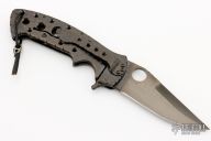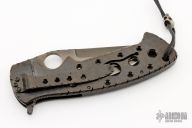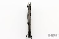 This Kasper Flipper from Pat & Wes Crawford features a DLC clip point blade with false top edge, thumbhole and flipper, jeweled flats and fileworked spine. The handle has a DLC titanium frame fileworked edges, jeweled and drilled titanium frame over carbon fiber backspacer. Matching titanium tip down clip. Excellent condition. Includes zippered case. Nice detent, lockup and blade seating.