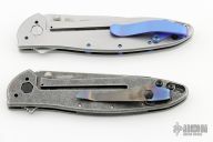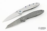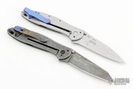 This Leek has a CPM-D2 composite drop point blade with dual thumb studs and flipper. Handle is stainless steel with blade safety, black fiber backspacer, and 2-way stainless steel tip up clip. Has a couple light scuffs and a ding in the blade edge, otherwise good condition. Comes with original packaging.