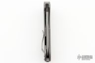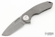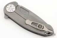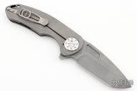 This F3 by Curtiss Knives features a stonewashed blade with notched thumbrest and flipper. The handle has a tumbled titanium frame with a matching tip up titanium clip. Satin stainless hardware. Rides on bearings, nice detent and lockup.  Comes with a zippered case. Excellent condition.