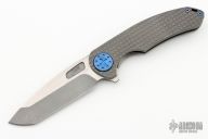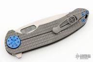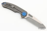 This Large F3 by Curtiss Knives features a two-tone blade with notched thumbrest and flipper. The handle has a Frag Pattern milled titanium frame with a matching tip up titanium clip. Rides on bearings, nice detent and lockup. Comes with a zippered case. Excellent condition.